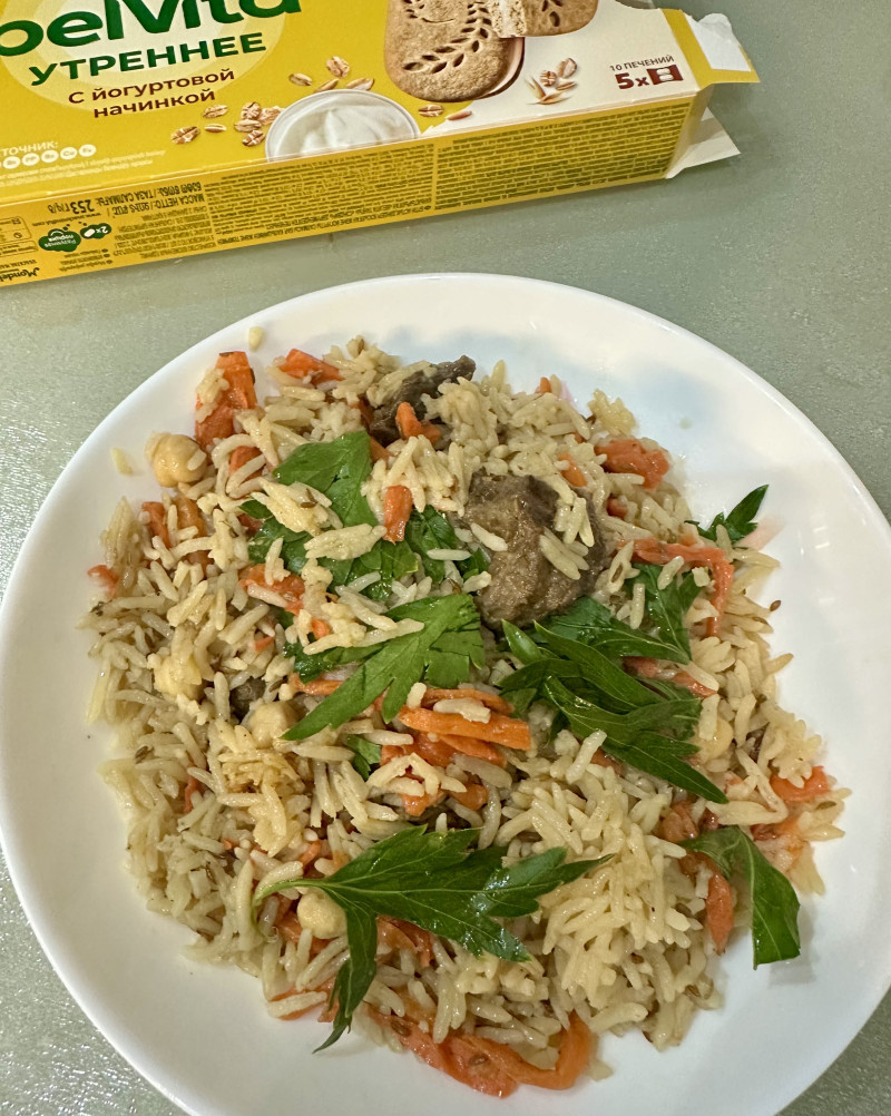 Плов, зеленый чай и сын купил мне мое любимое печенье)