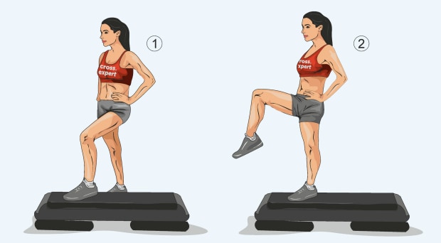 Если на минимальной высоте делать, то нагрузка невысокая на колени. У моего степа высота регулируется. Я им только на даче пользуюсь. В квартире небольшой степпер