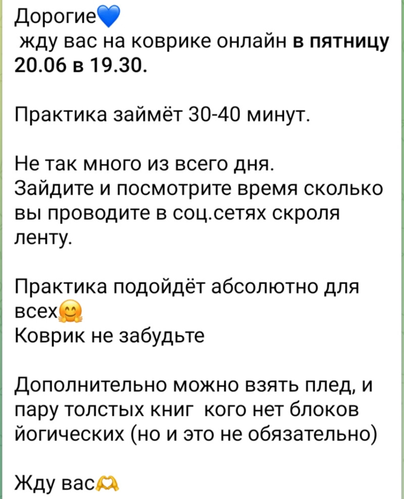 Если есть желающие, то могу поделиться Тг каналом йогини, она иногда дает бесплатные практики минут на 30-40.
