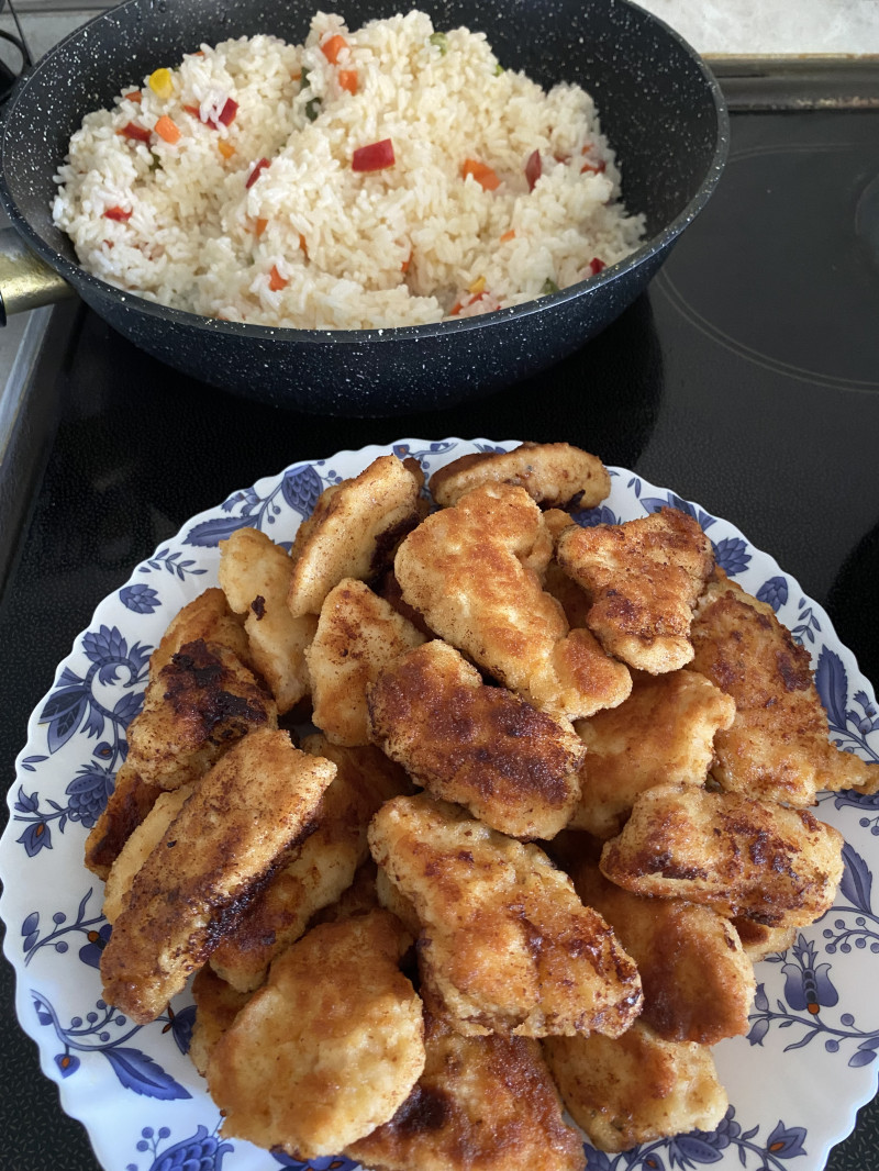 Наготовила на пару дней рис и куриное филе в панировке по типу наггетсов.