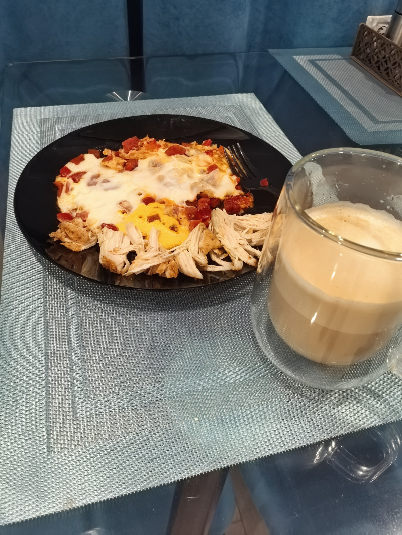 Мой ужин, яйца с помидором и перцем. Немного курицы и кофе!)