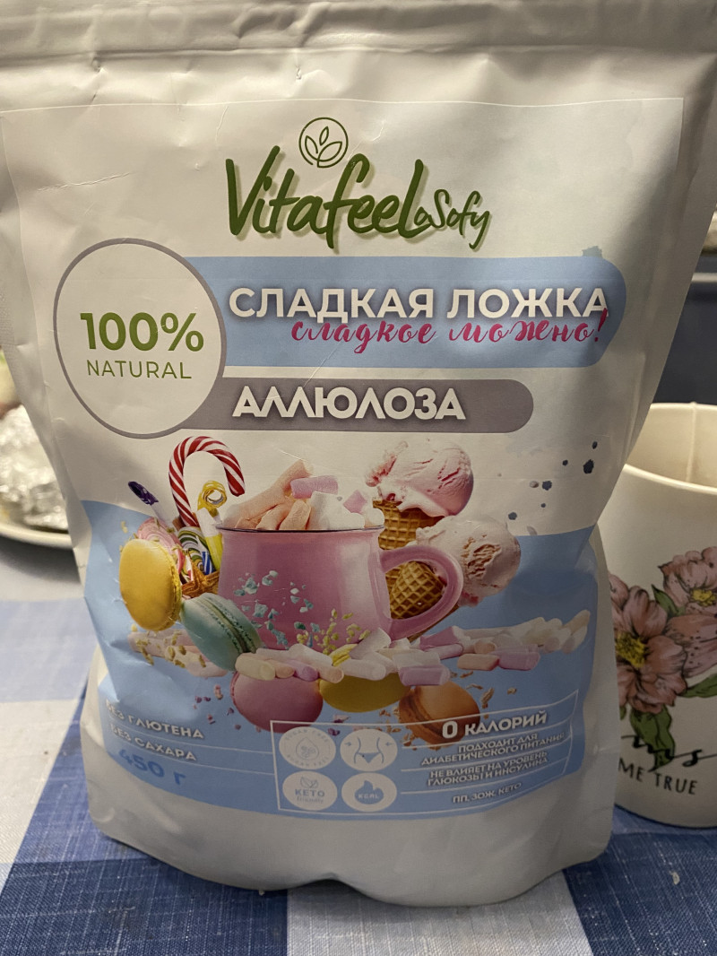 Никакого привкуса нет совсем, по консистенции порошок, не такая сильно сладкая как Сахар