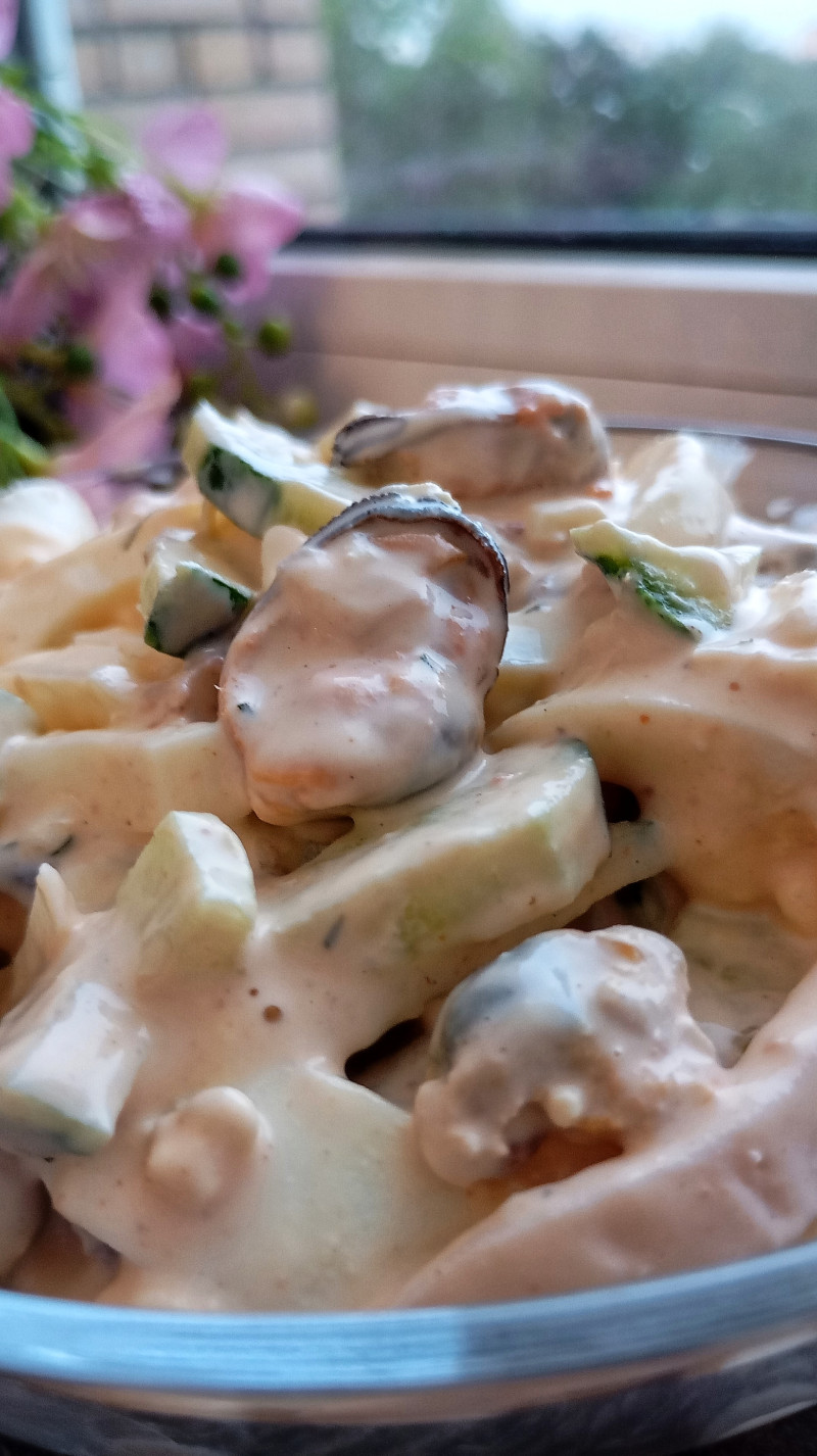 Упаковка кальмары+ мидии в соусе том ям( в Пятерочке) + 3 варёных яйца+ свежий огурец, перемешать и очень даже да. 👍