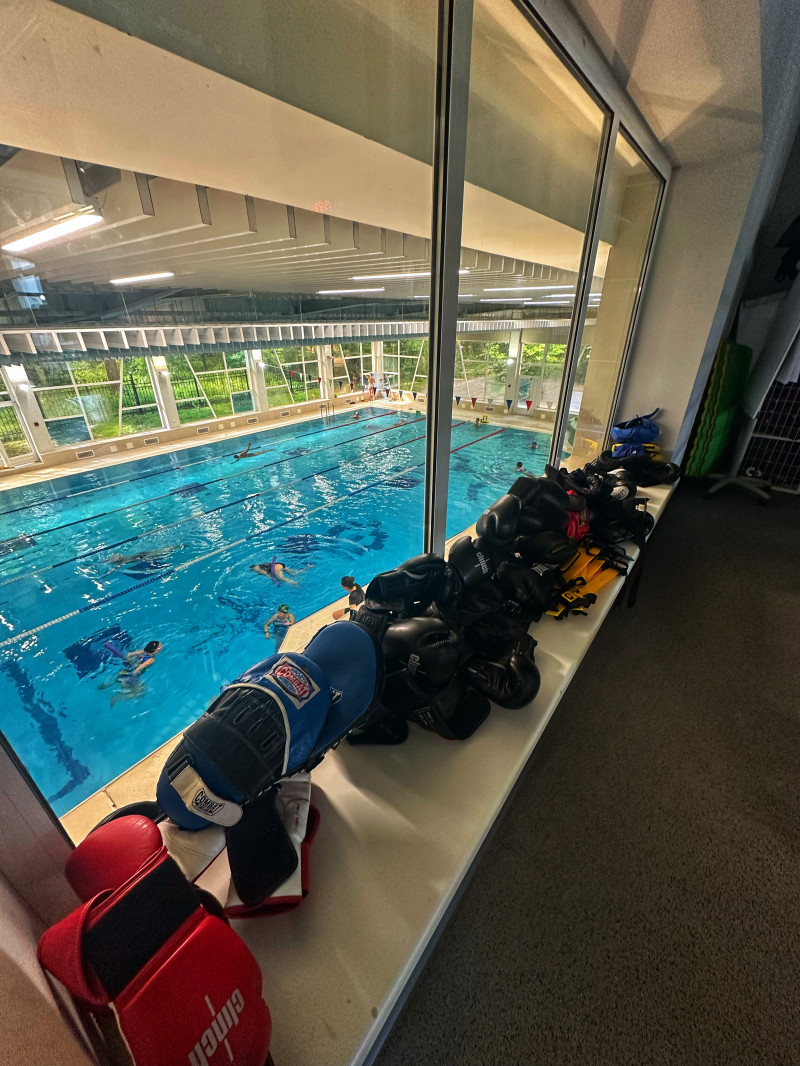 И есть любимая зона у всех для пресса на ковриках - между рингом и окном в бассейн