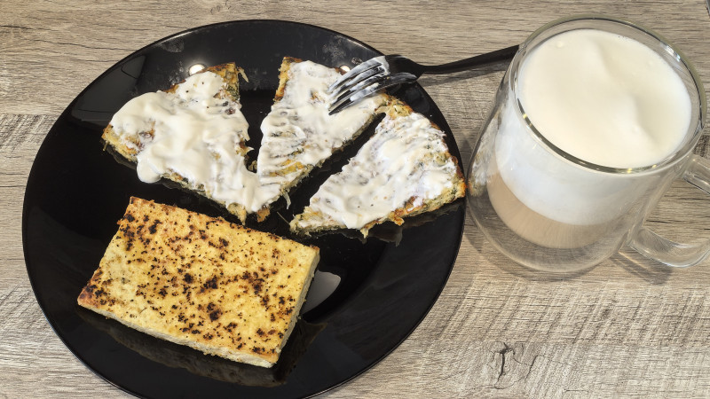 На ужин, блин из кабачка, яиц, сыра и зелени с тофу.