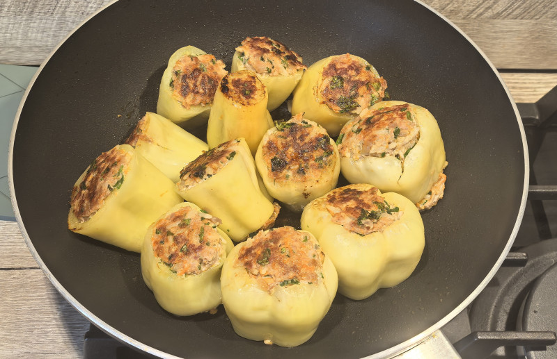 Фарш, обжарка лука и моркови, рис, петрушка, приправы. Ну и перец соответственно.