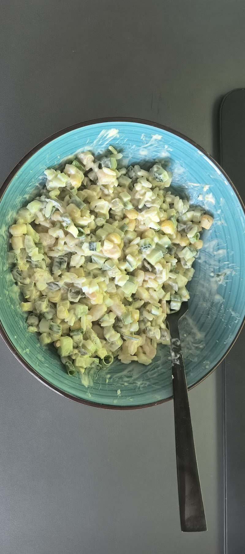На ужин салат. Креветки, рис, кукуруза, огурец солёный, огурец свежий, яйца, лук зелёный.