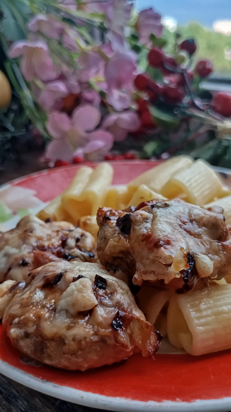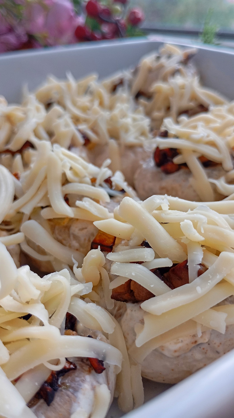 Их же ножки с луком обжареные и сыр. Сами грибы в майонезе немного обмазала с паприкой.