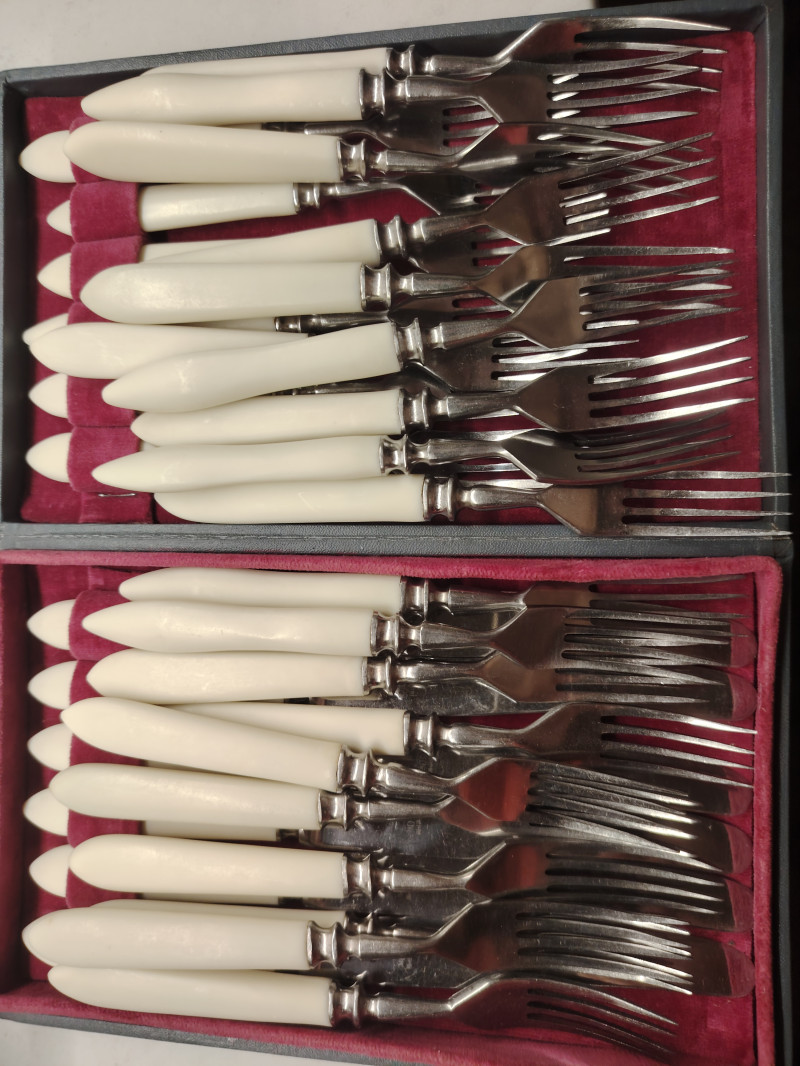 У бабушки такой столовый набор был только, там и ножи ещё были, именно в такой коробке, со временем ручки кажется пожелтели