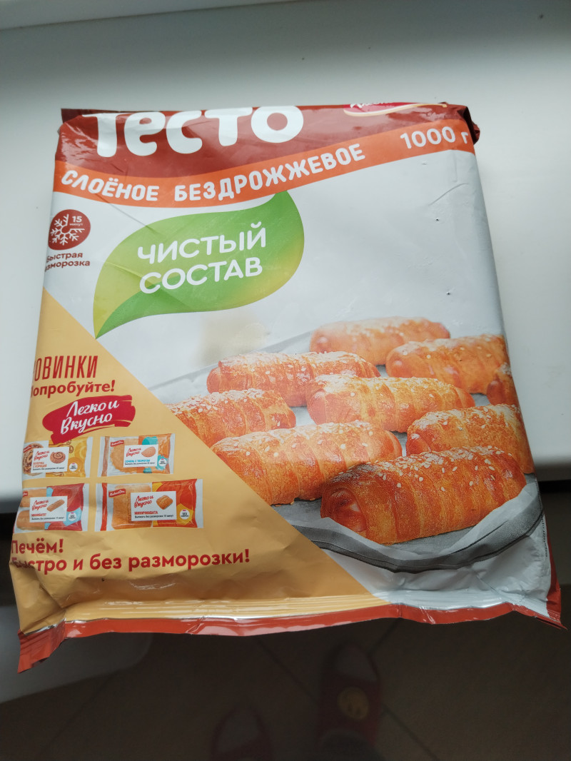 мука пшеничная хлебопекарная высшего сорта, вода питьевая, маргарин (масла растительные рафинированные дезодорированные, вода, ароматизатор натуральный), соль, регулятор кислотности - кислота лимонная Продукт может содержать следы сои.