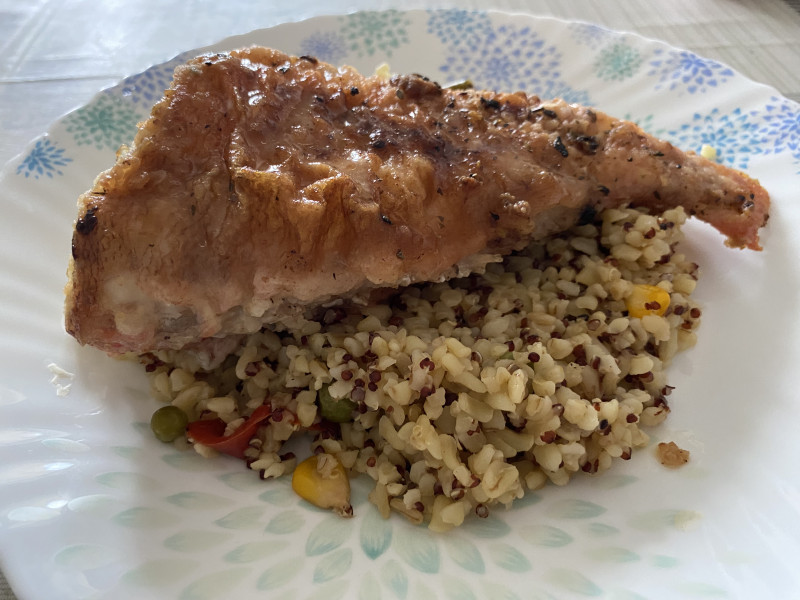 Обед. Булгур с киноа и мексиканской овощной смесью и окуни.