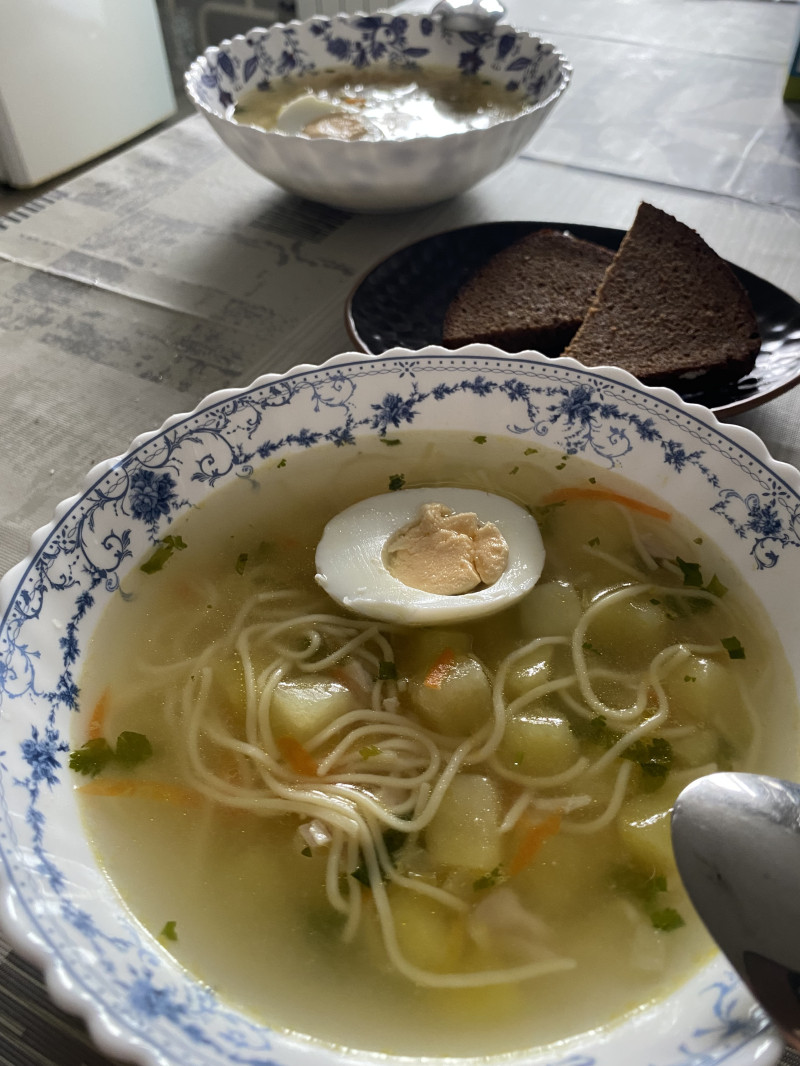Суп поели и хлеб натёрли чесноком.