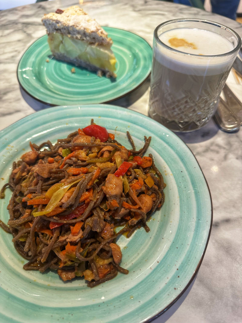 Обед в Бруснике - гречневая лапша с курицей и французский торт (яблоки печеные на миндальных коржах)