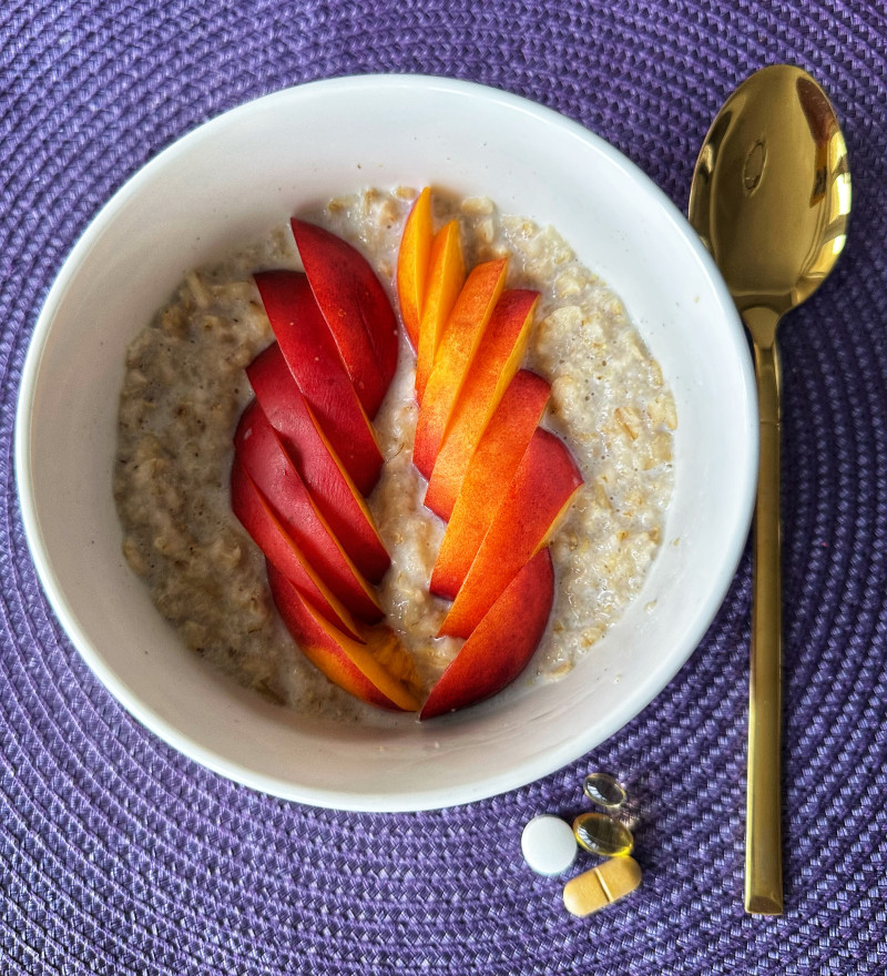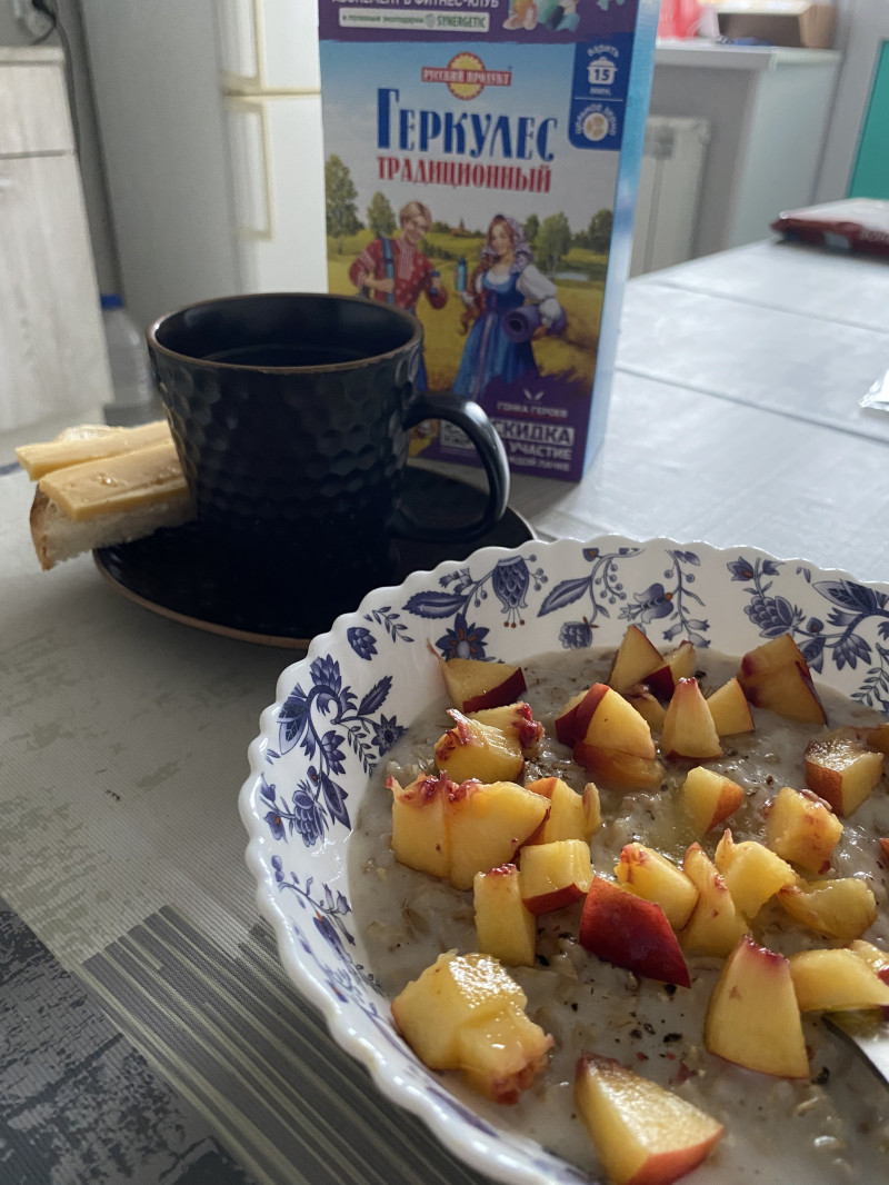 На завтрак был домашний йогурт с нектарином и кофе с бутером.
