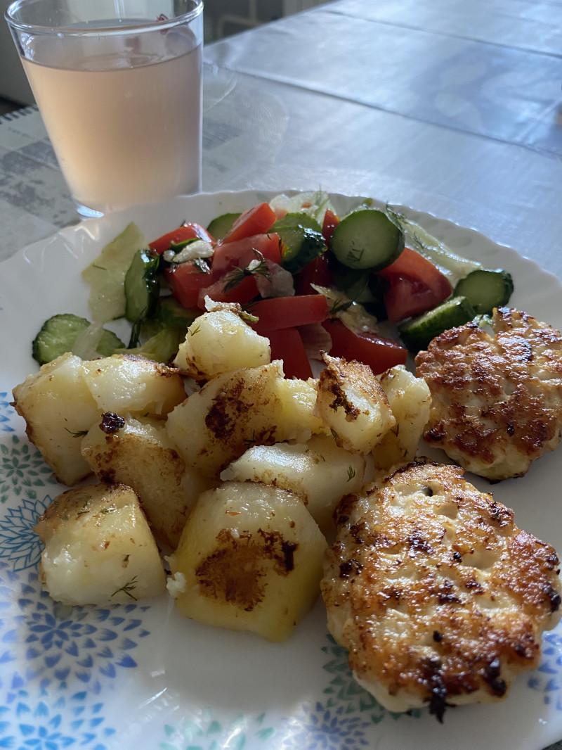 Рубленые куриные котлеты с сыром, обжаренная вареная картошка и салат на горчичном масле. И аомпот))