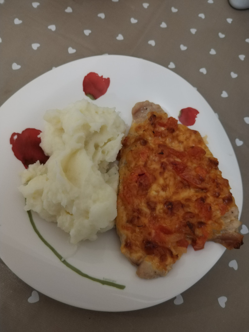 Дочка едет. Отбивная индейка под шапкой из пассированным луком, помидорка, сыр и немного майонеза. Ещё пирог стряпаю.