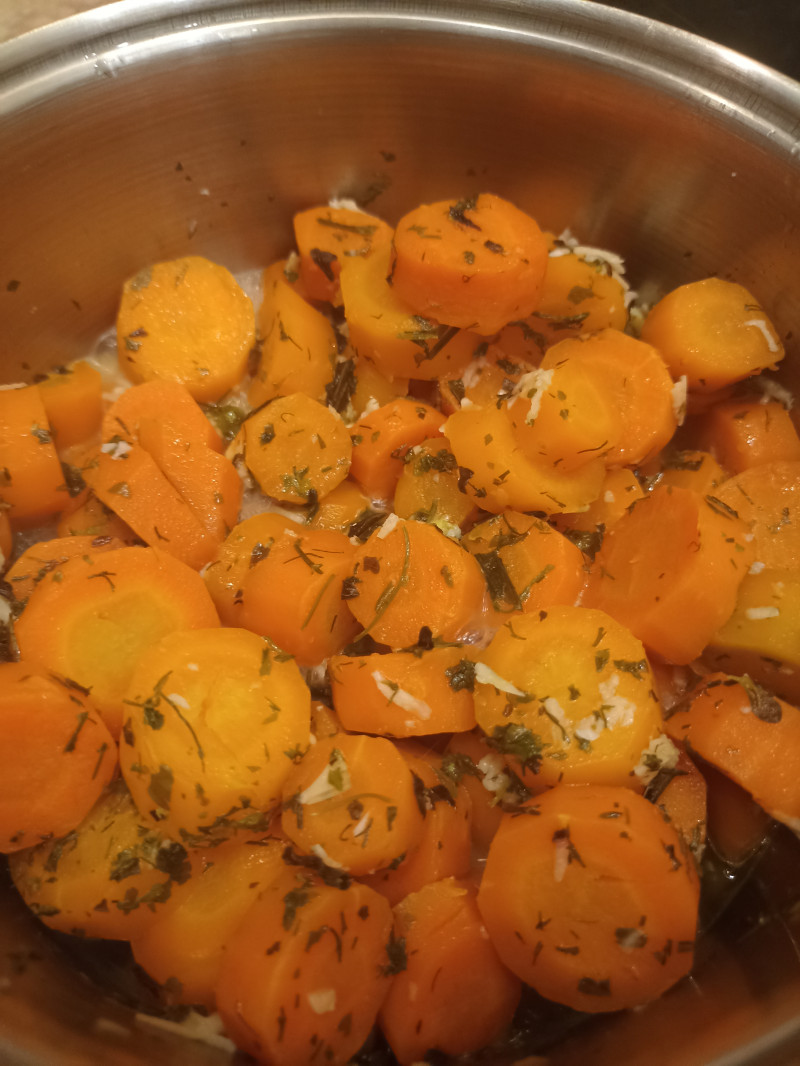 Морковь крупным кружком 0,5 см +- в кастрюлю + немного водички, томить под крышкой до мягкости, потом масло сливочное, чеснок тертый у меня три зубчика крупных, соль/перец по вкусу, зелень, лучше петрушку.