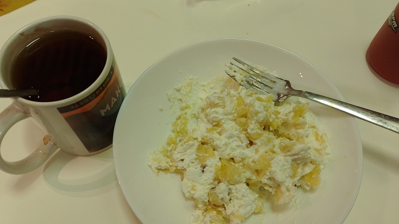 Всем доброе утро! Завтрак творог и банан, чай. Дома взял кусочек айвы...