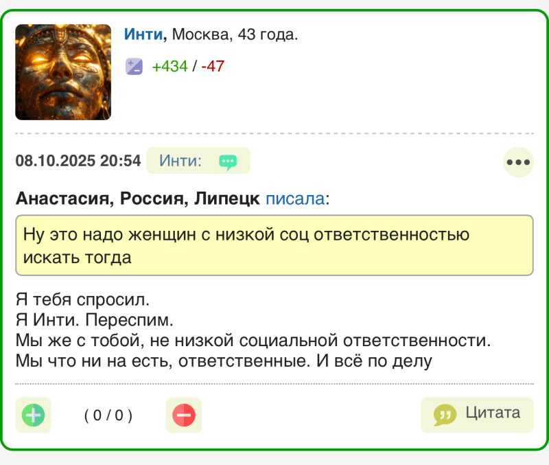 Все У меня новая цитата с форума для все мужчин лайфхак: «Я Инти. Переспим» (с)