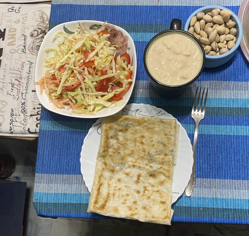На завтрак были сырники мо сметаной + кофе, на обед - цезарь. На ужин будет мясо по-французски со свежими помидорами.