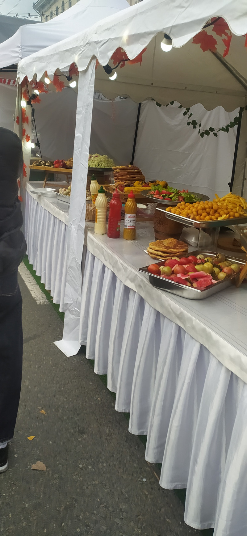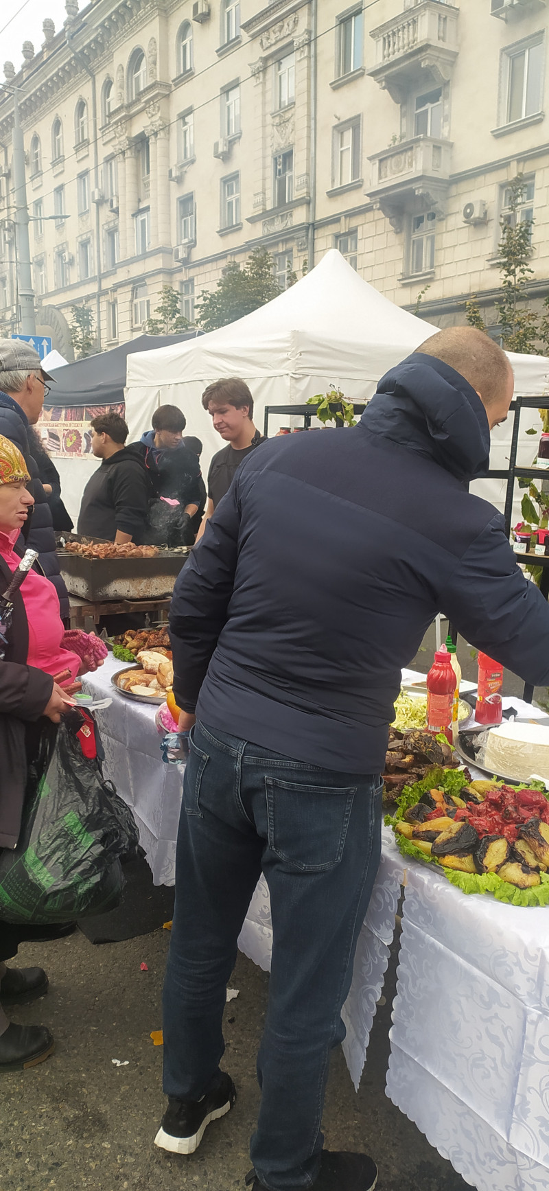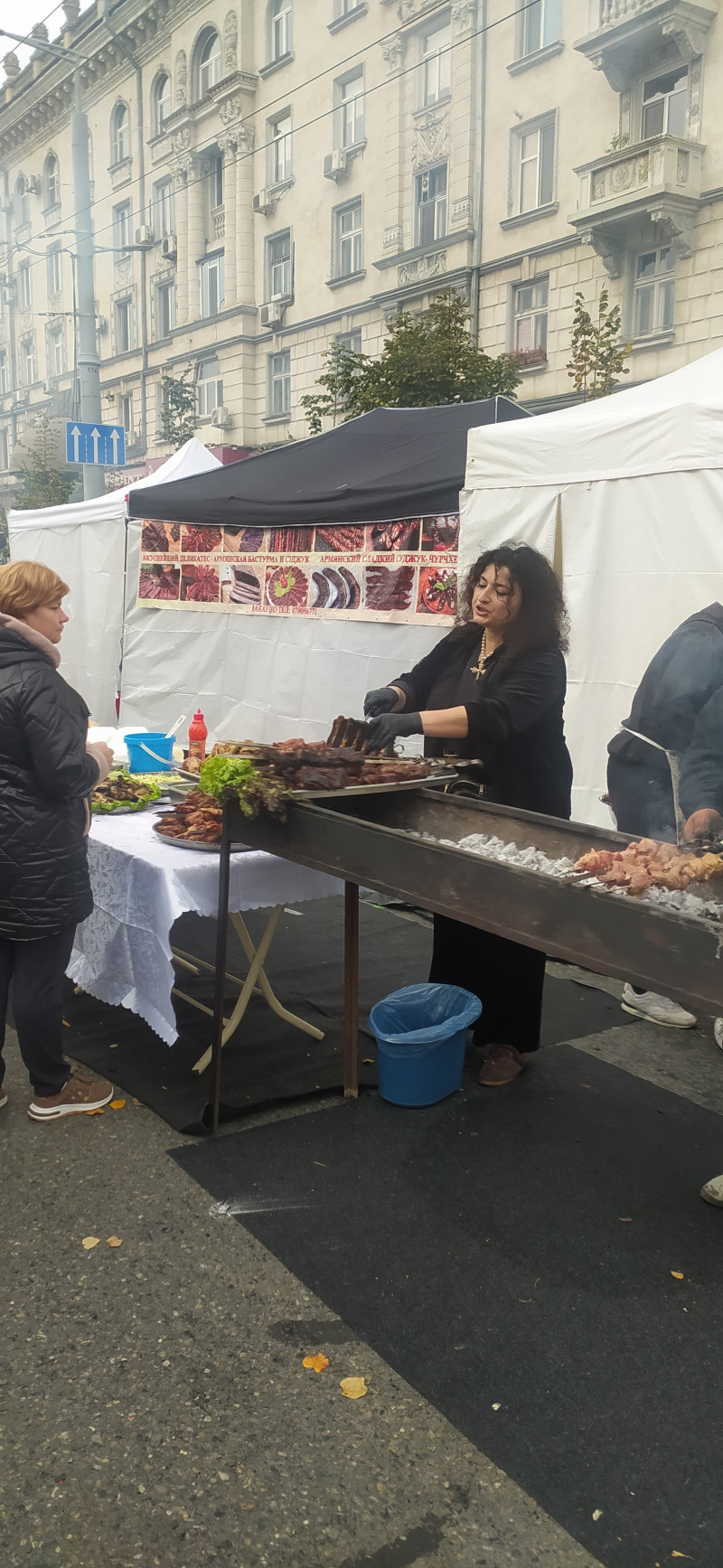 Покажу немножко и город. Он странно выглядит, когда вместо транспорта барбекю, но имеет свое очарование. Это провинциал приехал на заработки в столицу Он же - сгорел на работе... Рулька наверное Шашлык-машлык Праздничное хлебобулочное изделие. Такое обычно не едят, а украшают им стол на свадьбах Армянские рёбрышки, но это не точно... Плацинды (если найдете на фото, пирожки, по которым прошёлся каток) и овощи, закуски Сегодня погода не очень, даже дождик был немножко, по