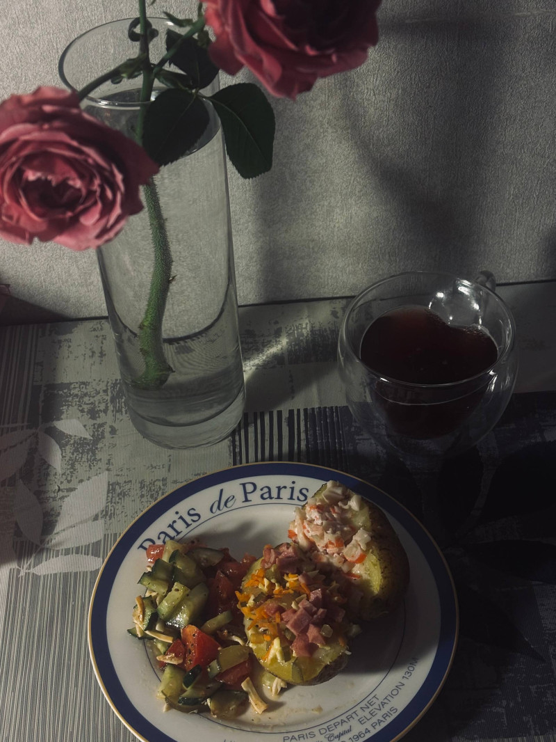 Вчера запеченный картофель с начинками: крабовые палочки и соленый огурец.