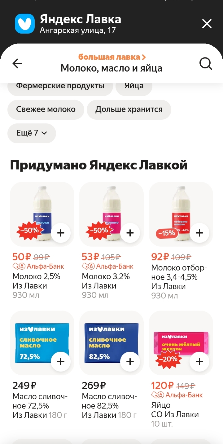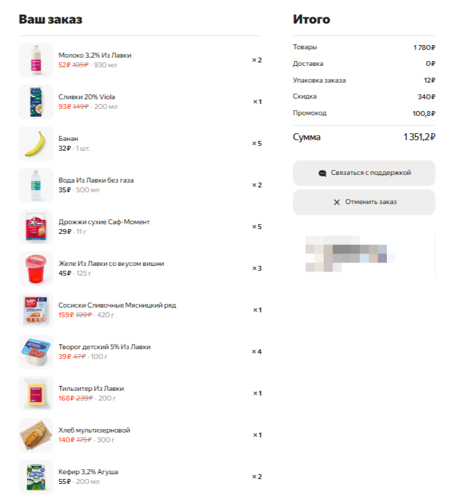 Приложу пример корзинки на 1350 руб. в Лавке + в Альфе у меня действует 5% кэшбека на продукты до конца месяца. Есть мнение, что в Лавке дороже рынка стоят продукты. В целом не так уж и выше.