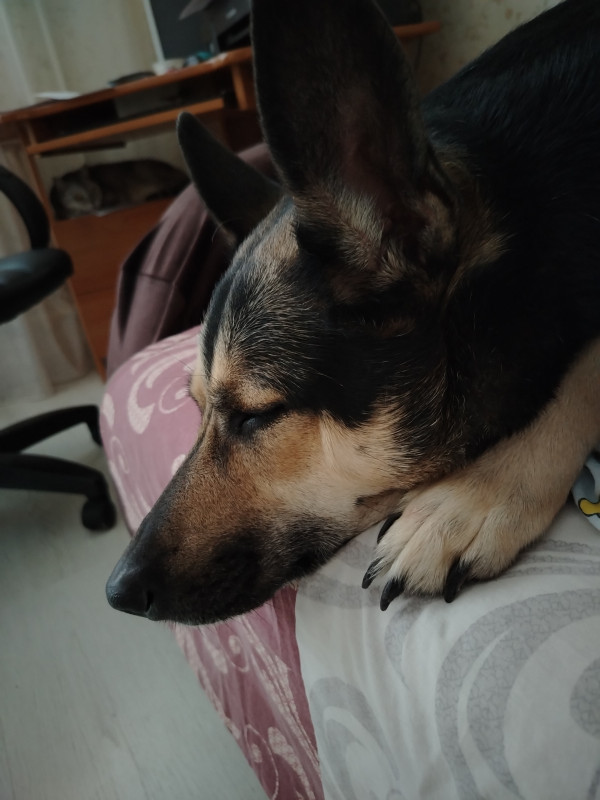 Пес залез на диван и спит. Вообще ему нельзя.