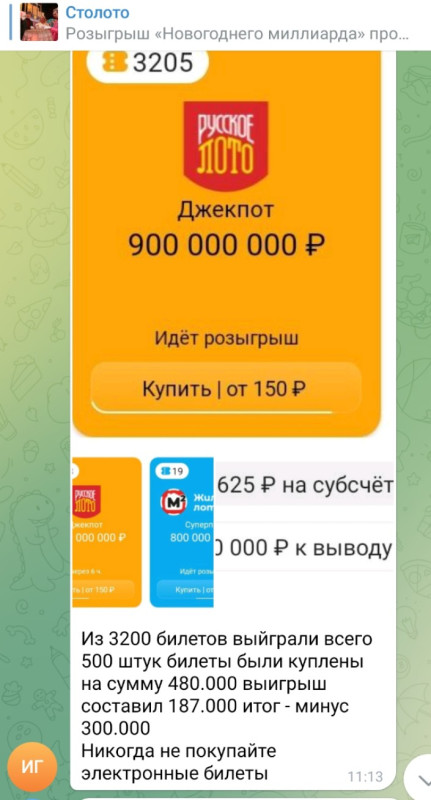 Согласна с ним! И в Москве тоже не стоит покупать. Мои билеты папа привез из Питера, покупал в Ленте на Таллинском шоссе. Все три билета выиграли - это самый восторг! Раньше максимум один из десяти был.