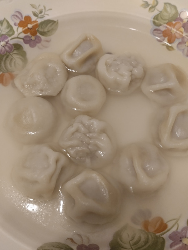 А у нас домашние пельмени с бульоном.