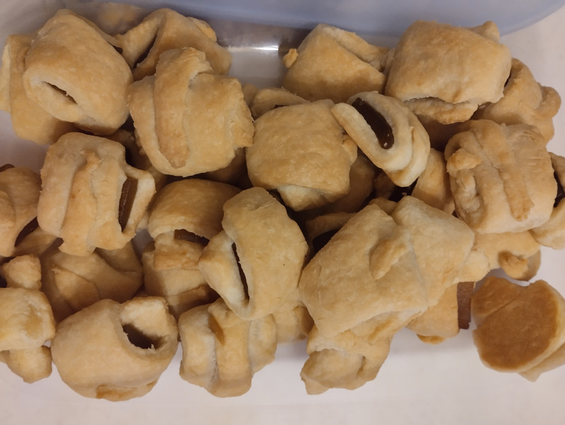 Я испекла рогалики. Теста пресное бездрожжевое. Начинка - пластовый мармелад.
