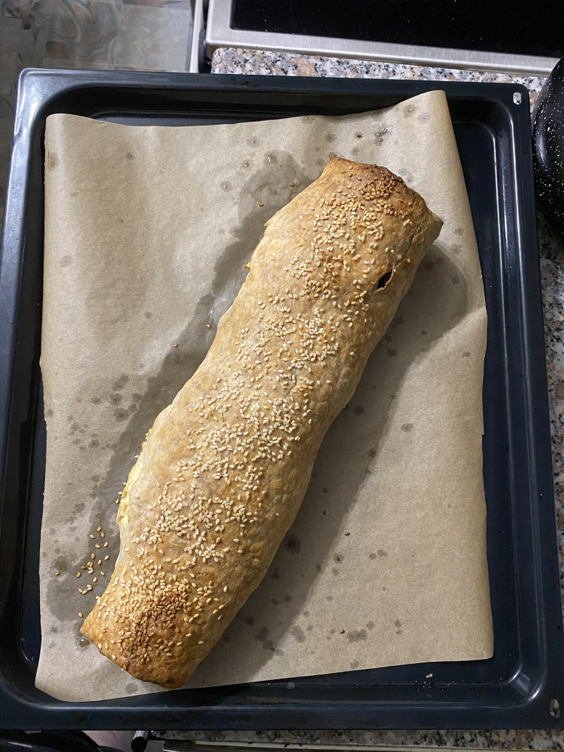 Скатать рулет. Смазать или желтком или растопленным маслом, посыпать кунжутом. Выпекать при 200 градусов до золотистого цвета