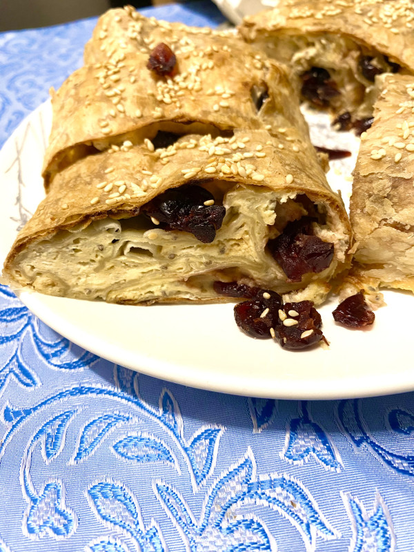 2 листа лаваша, две пачки творога, 2 яйца, семена чиа, ванилин, соль, пара ложек творопыша, сухая клюква, сироп финиковый