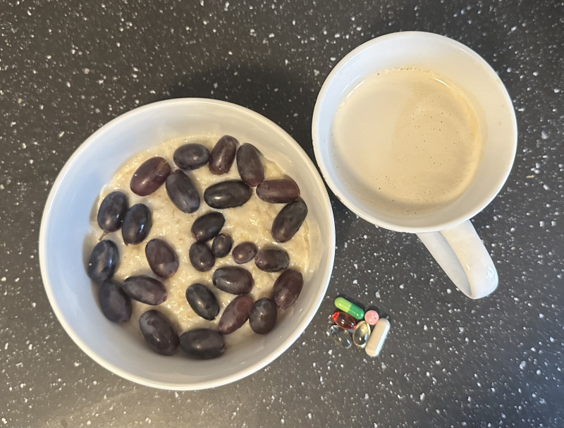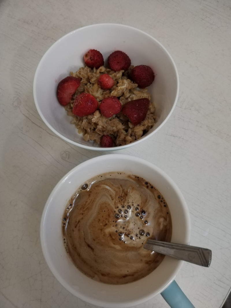На завтрак пара яиц, запеканка, кофе. Ещё надо таблетку от головной боли, но сначала доехать до работы!))
