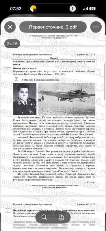 Чтение текста вслух — предлагается небольшой текст (около 180–200 слов), как правило, научно-популярного или публицистического характера. Задача — прочитать текст выразительно, чётко и без грубых ошибок.