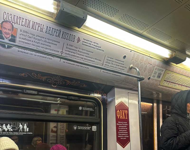 Ой, прикольно. Сейчас в метропоезде «Что? Где? Когда?» едем! После каждой станции вопросы задают и отвечают!