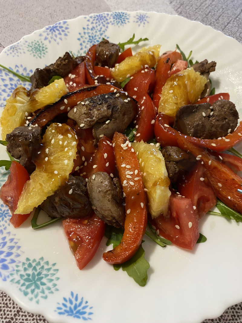 Теплый салат с печенью, болгарским перцем и апельсином. Это восторг!