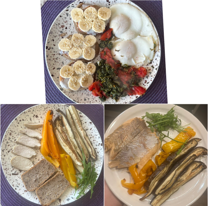19.20 ужин. Форель запеченая, баклажан/перец запеченые, руккола, ложка оливкового масла, черный орех
