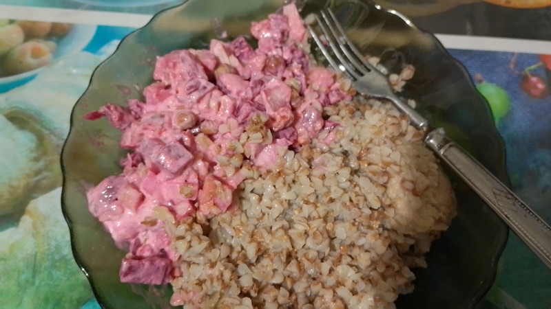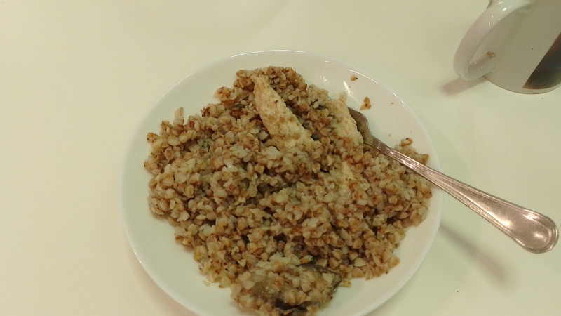 И вечером гречка - куриная котлета и баклажаны
