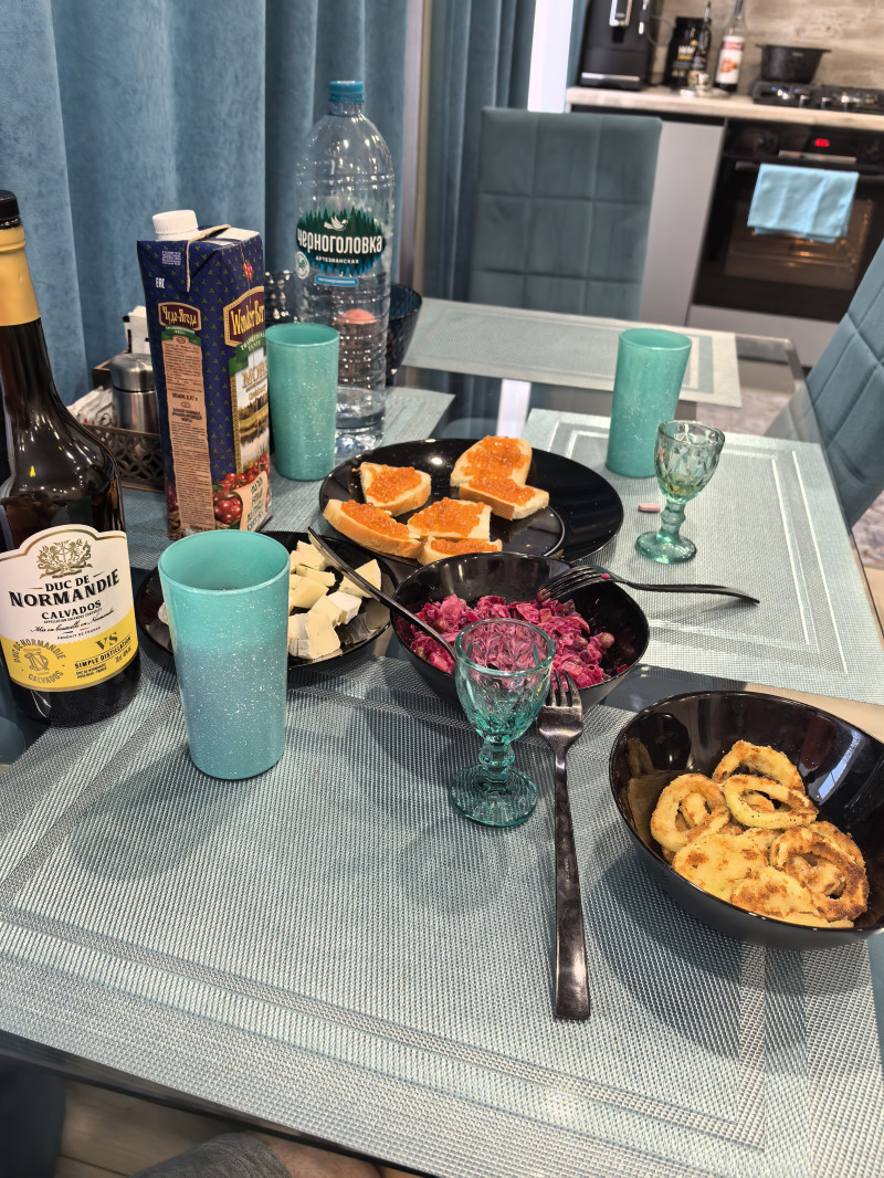 Обед плавно переходящий в ужин!)) Кабачки в панировке, винегрет, сыр бри и с голубой плесенью, бутеры с икрой, грибочки в духовке готовятся, шашлык с люля должны привезти!) Ну и кальвадос))