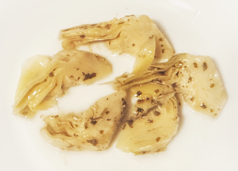 Артишоки консервированные, салатный микс, каперсы, яйцо перепелиное (у меня копченое), ещё туда идёт картошка печеная в мундире, но я не добавляла. Заправка: оливковое масло, винный уксус, горчица дижонская, сахар, соль, перец.