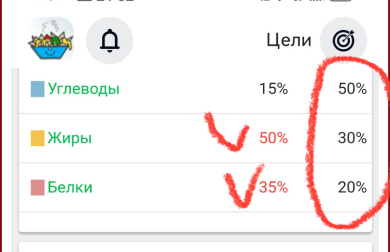 Так, ну смотри! Я обвела те показатели БЖУ в % соотношении, которые тебе рассчитала прога, а выбрал ты сбалансированную диету в настройках судя по всему - красным прога подсветила показатели, которые превышены, нужно примерно попадать в них.