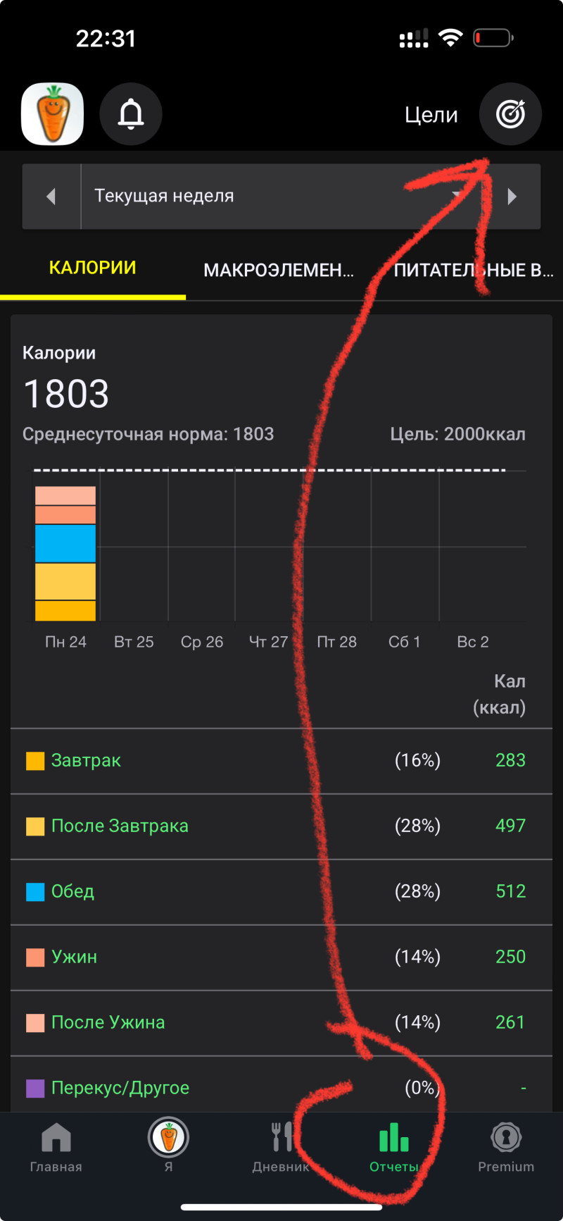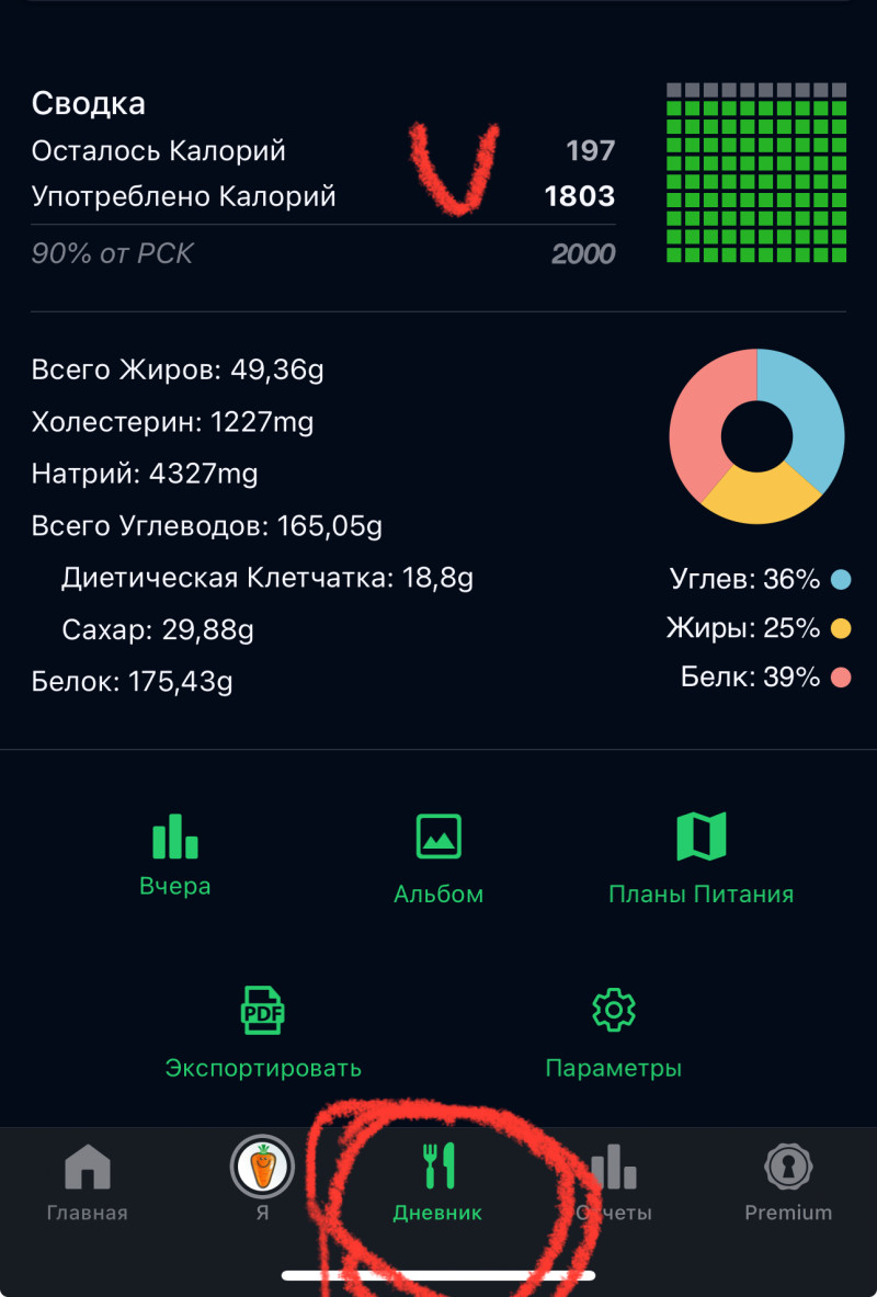 Норма и сколько ты съел калорий за день. Это все на вкладке «Дневник»