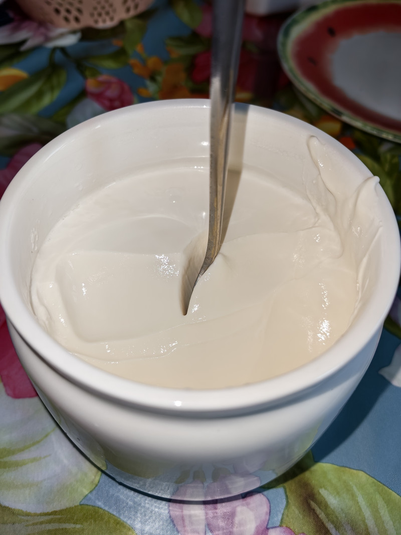 Домашняя сметана жирности всего 10%, но великолепный вкус и густота как у 30% (ложка стоит). Это сливки 10% с закваской "сметана" в йогуртнице.