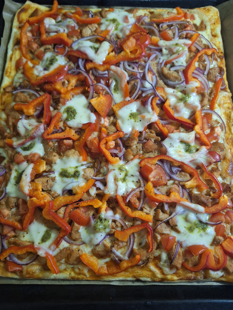 Пачка теста слоёного, целая подложка грудки (замариновала в соевом соусе), томатный соус домашний, моцарелла, немного соуса песто, красный лук, болгарский перец, помидоры