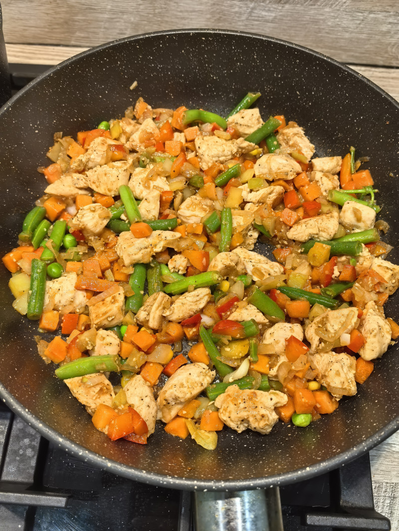 У меня лук, красный перец, мексиканская смесь и куриное филе с соевым соусом и терияки )