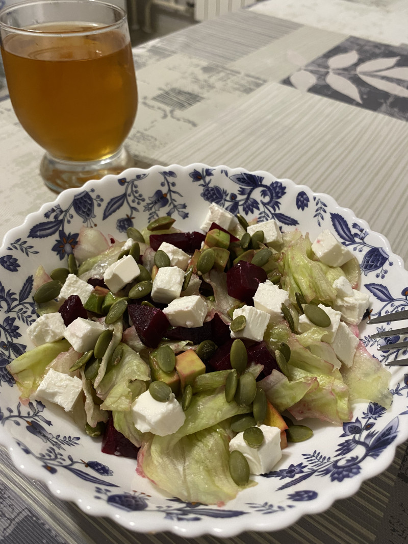 Салат на ужин: листья айсберга, авокадо, свекла, рассольный сыр, заправка масло и для украшения тыквенные семечки