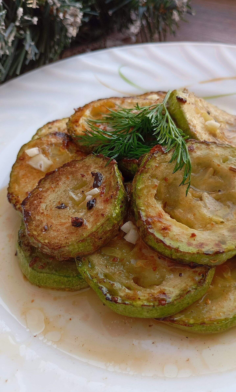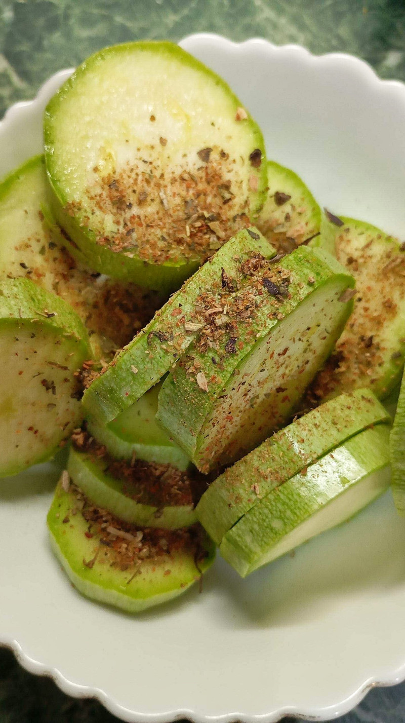 Ужин.... Кабачки порезала, замариновала в специи этой и растительном масле, обжарила и добавила чеснок и зеленушку.