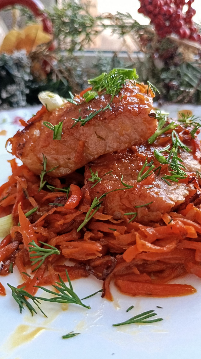 Ужин: свинина обжареная до золотистости, потом её убрала, на этой же сковородке пассировала морковку, добавила немного приправ , вернула к ней свинину и добавила соевый соус, потомила все минут 5. И ещё салат из огурцов, помидор сделала.