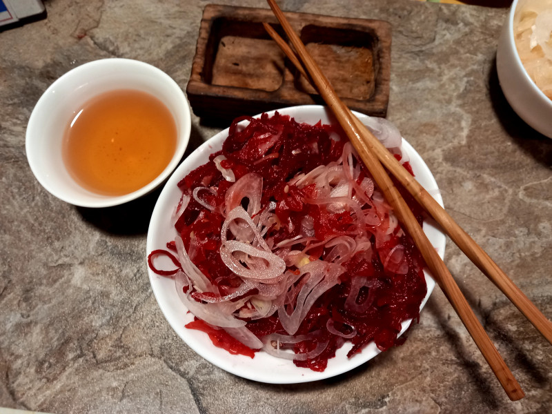 2. Сырая свёкла натёртая мелкой теркой, в соломку, +/- как для моркови по корейски.